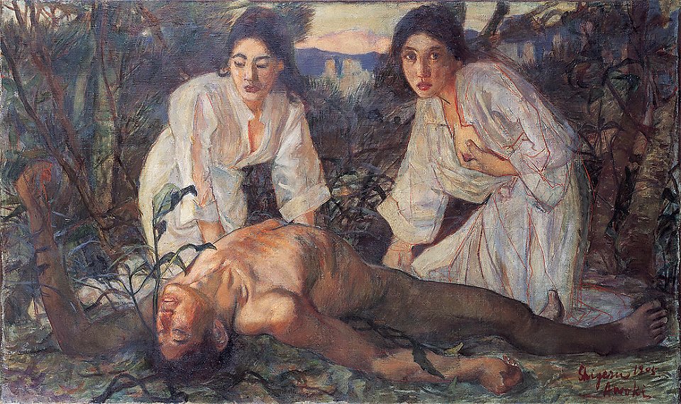 A mulher velando os pés do homem morto encara os passantes em olhares inquisitivos, e ao mesmo tempo parece velar uma justificativa pelo que faria a seguir, como se tal atitude fosse a única obrigação que alguém em mínima decência e coragem descreveria. Seus olhos explodiam uma luta interna entre a culpa e o ódio contra àquela situação. A boca atônita, afoita e aberta entremeia. Os cabelos castanhos escuros amendoavam seu rosto em nervosismo ao nariz milimétrico, alinhado perfeitamente com o mamilo exposto de seu seio esquerdo que repousava fora do vestido em sua mão. Mimetizando o flagrante de uma atitude imensurável, desculpando-se enquanto acusa as pessoas e o descaso pelo que teria de fazer. A segunda mulher, com o vestido completamente branco sem riscas avermelhadas e de breve abertura até o meio do osso esterno, está ajoelhada na altura do peito de Francisco, observando seu rosto em certeza de olhos invariáveis. A boca simétrica, um portão fechado adornado por uma tristeza econômica e precisa, como se engolisse o luto. Mãos ao chão em braços de marquise, observa todos os contornos do rosto redobrado do homem. Os cabelos divididos ao meio, resignados tal qual seu olhar, desesperados por poderem gritar, porém, resolutos em um silêncio anacrônico envolto por todos os versos das orações que eram ditas silenciosamente.