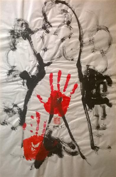 As feridas abertas perfazem paradigmáticas relações unidas pelo sangue que escorre. Todo o corpo agora parece adquirir uma cor arroxeada pelas pancadas instalando-se em cronicidade. As pernas repousam, no pequeno serrado feito pelo terreno, esticadas e com os pés fechados em ângulo valgo; sustentam a contração involuntária das coxas enfermeiras nos dois joelhos fraturados e revirados. As duas pernas são formadas por listras nos locais onde os cassetetes açoitaram a musculatura depois da terceira salvação. Os cortes ampliam-se em tempo recobertos por pedaços de madeira, corda ou borracha, atiçadas pelo fardamento dos policiais ou pelo regurgitação da forca. Ajoelhadas ao lado do corpo estão duas mulheres de vestidos quase completamente iguais. Dançam descontentes removidos em suas métricas pelo vento norte que sopra no local do enforcamento. As vestimentas apenas diferenciam-se por uma linha vermelha que contorna a roupa daquela aos pés de Chaguinhas.